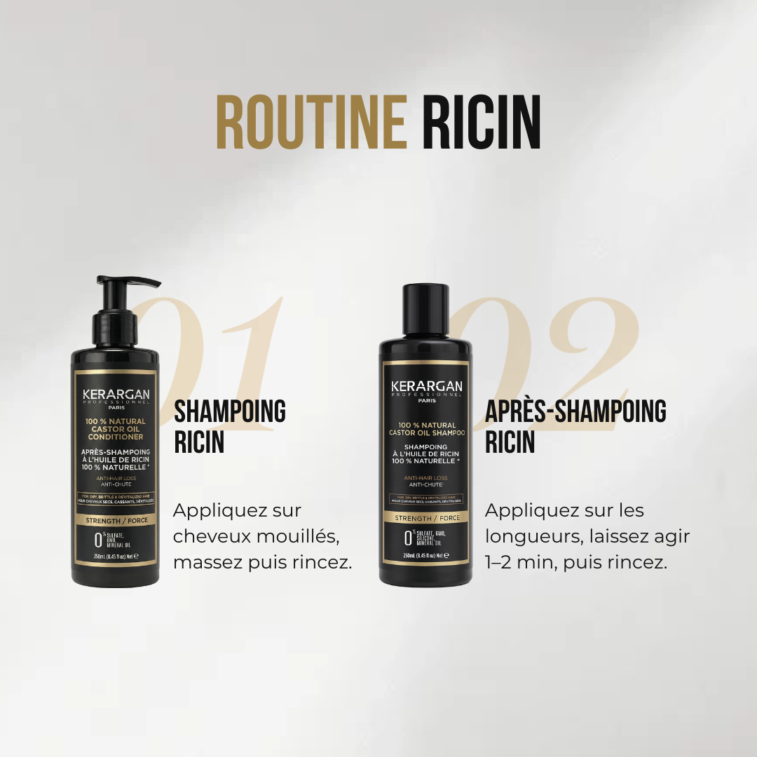 Avec l’huile de ricin comme actif principal, ce kit installe une routine simple pour aider à renforcer la fibre et accompagner la pousse. Le shampoing nettoie en douceur et est enrichi en kératine, huile d’argan et aloe vera ; l’après-shampoing est complété par kératine et huile d’argan pour faciliter le démêlage et améliorer le toucher.
